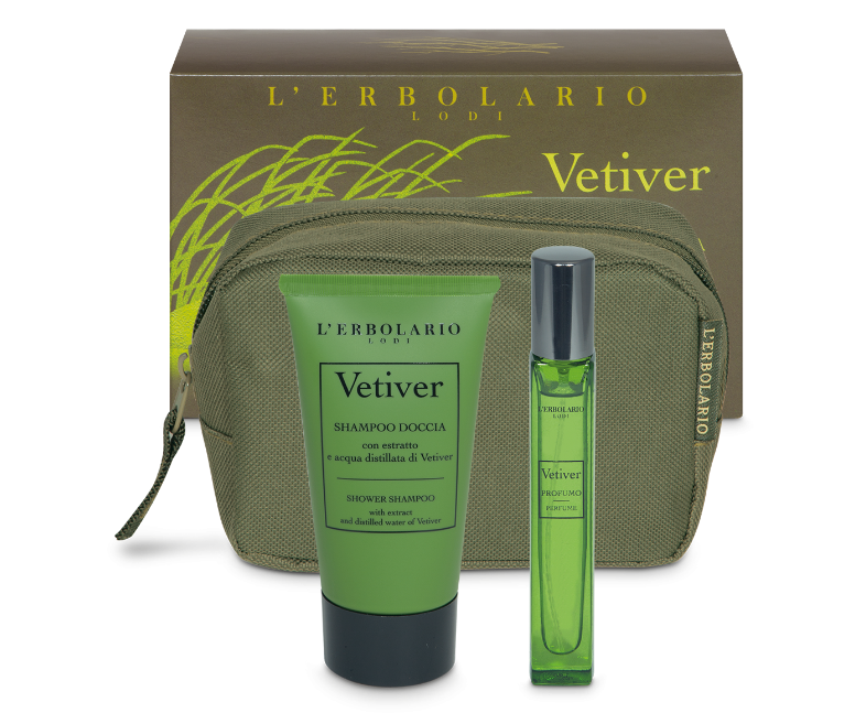 Questa pochette, dal bel colore verde come le foglie del Vetiver, custodisce Profumo e Shampoo Doccia in formati da viaggio. È perfetta quindi per aver sempre con sé i cosmetici essenziali per i gesti di bellezza quotidiana.