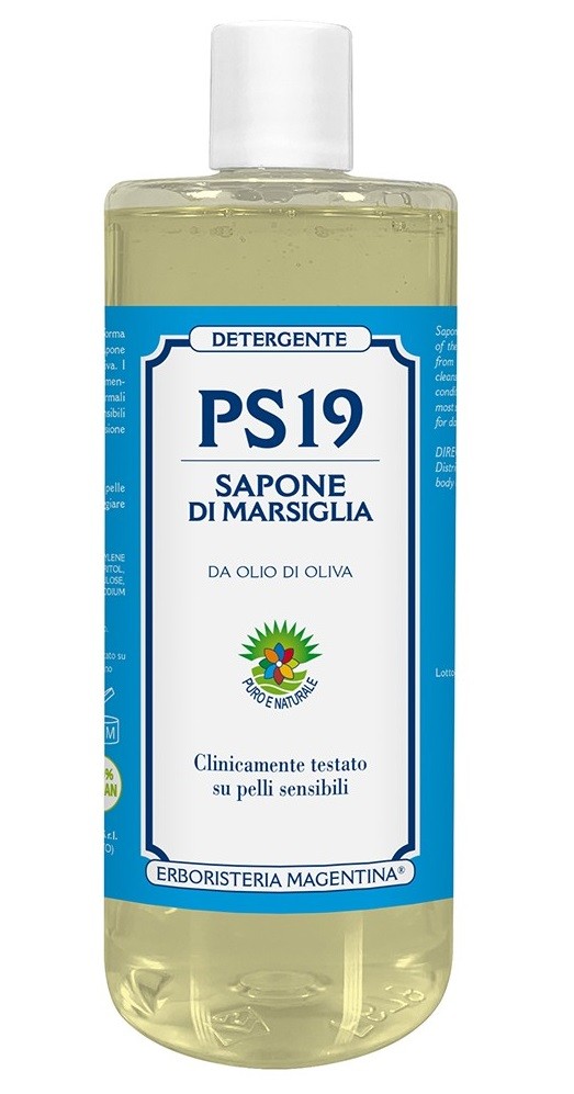 PS19 Detergente Sapone di Marsiglia: detergente per la cura quotidiana delle pelli fragili e sensibili con sapone di Marsiglia.
