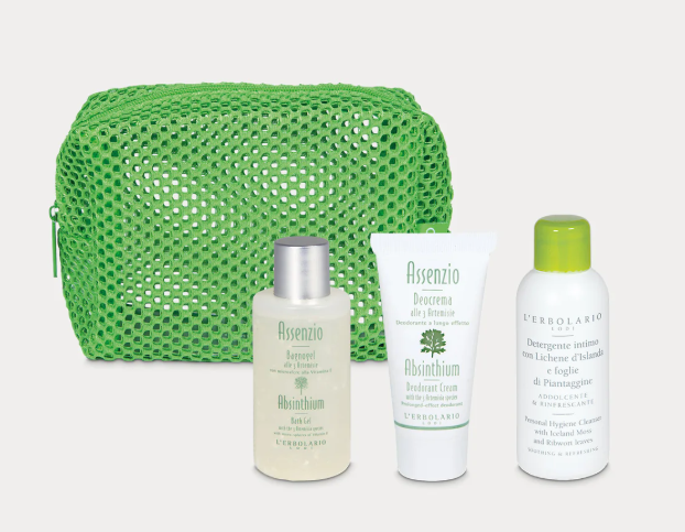 Grazie a questo travel kit puoi prenderti cura dell’igiene quotidiana del corpo, assicurandoti comfort e freschezza in vacanza o durante i viaggi di lavoro. La deliziosa pochette contiene Bagnogel e DeoCrema Assenzio insieme al Detergente intimo con Lichene d’Islanda e foglie di Piantaggine in formato viaggio. Il kit da viaggio è anche un’idea regalo perfetta per weekend di vacanza o lunghe giornate fuori casa.