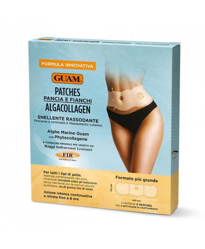 Guam Patches Pancia e Fianchi AlgaCollagen è un trattamento urto snellente rassodante ad azione intensa, continuativa e mirata per 8 ore.