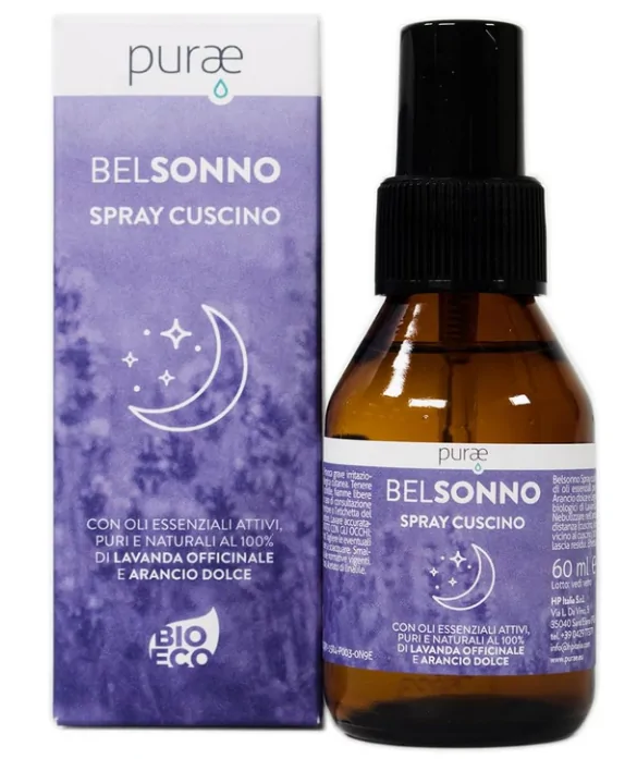 Belsonno Spray cuscino è uno spray per ambiente e tessuti a base di oli essenziali puri e naturali al 100% di Lavanda officinale, Arancio dolce e Legno di Cedro dell'Atlante e con estratti vegetali biologici di Lavanda officinale e Camomilla.