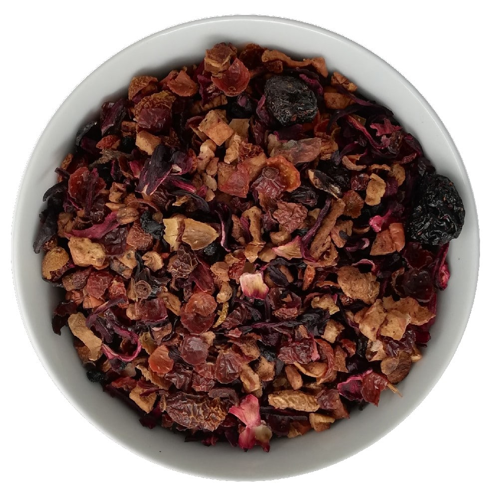 FIORI DI IBISCO, AMARENE, BACCHE DI ROSA CANINA, PEZZI DI MELA, CILIEGIE, BACCHE DI SAMBUCO, AROMI, AROMA NATURALE DI CILIEGIA.
