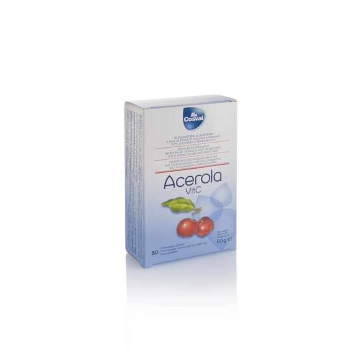 Acerola: integratore alimentare a base di estratti vegetali e derivati, con zucchero e edulcorante.