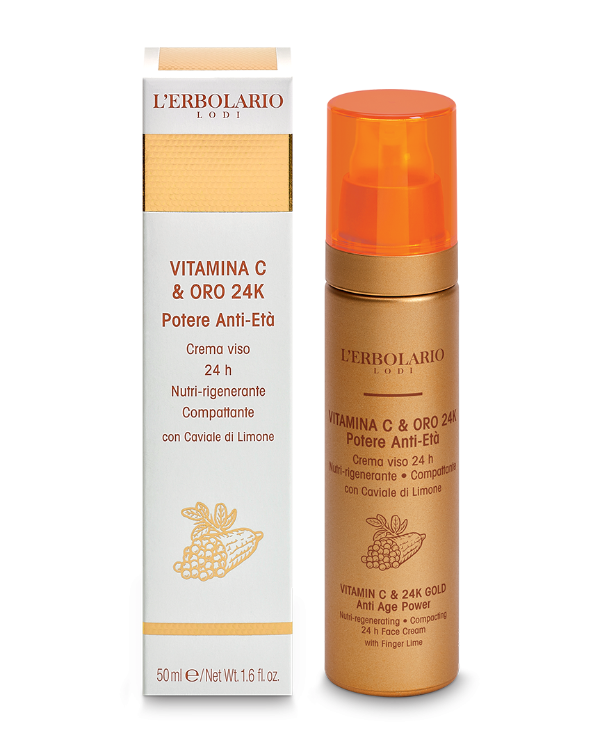 Grazie all’innovativo legame di Vitamina C e Oro 24 carati, questa preziosa crema giorno e notte offre un risultato sorprendente: rughe superficiali visibilmente attenuate e pelle immediatamente più levigata, compatta, luminosa. Le particelle di Oro puro hanno infatti il potere di veicolare efficacemente a livello cutaneo la Vitamina C, potenziandone la funzione antiradicalica e antiossidante. Si attivano in sinergia anche l’Acido Ialuronico ultrafiller, dal potere superidratante e antietà, l’estratto di Caviale di Limone e il succo di Pompelmo rosa, ricchissimi di Vitamina C.