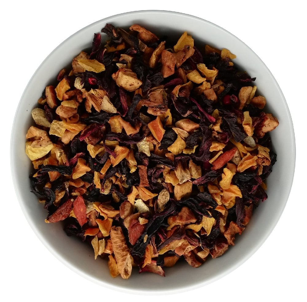 PEZZI DI MELA, FIORI DI IBISCO, FIOCCHI DI CAROTA, BACCHE DI GOJI, SCORZE DI ARANCIA, AROMI, PEZZI DI ZENZERO, GRANELLI DI PEPE ROSA.
