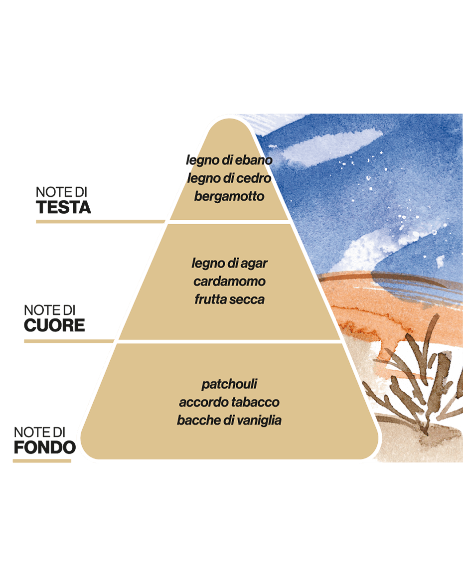 Notte nel Deserto ti conduce in un paesaggio desertico sotto un cielo stellato. Le note di testa di legno di ebano, cedro e bergamotto evocano l'aridità misteriosa del deserto e la freschezza della notte. Nel cuore, il legno di agar, il cardamomo e la frutta secca aggiungono un tocco speziato e ambrato, creando un aroma ricco e avvolgente. Le note di fondo di patchouli, tabacco e vaniglia completano il viaggio con una scia orientale e voluttuosa, che riecheggia nel silenzio della notte.