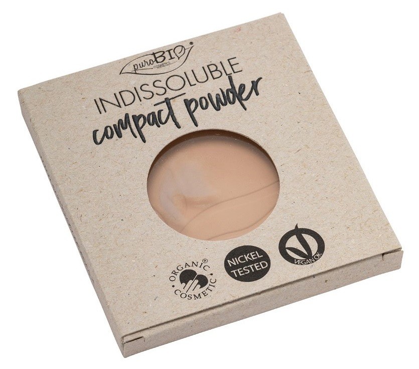 La cipria INDISSOLUBLE di PuroBio Cosmetics opacizza l’incarnato, grazie alla presenza di silica, amido di mais, polvere di riso.