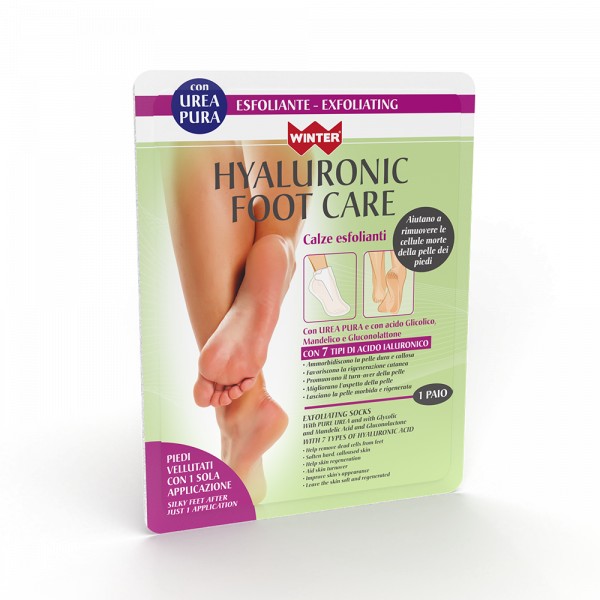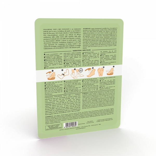 Le calze esfolianti Hyaluronic Feet Care contengono Urea Pura al 25%, 7 tipi di Acido Ialuronico, Acido Glicolico, Mandelico e Gluconolattone.